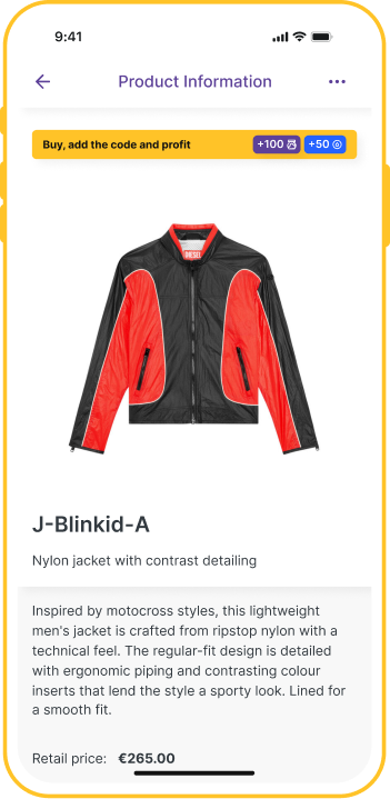The user can verify product data and access detailed information such as ingredients, description, and origin, while also collecting Digi Passes and earning rewards from them.